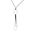 Se observa cordón negro con terminaciones metálicas y cadena de extensión. El diseño mantiene una caída prolija y el colgante se destaca por su silueta alargada.