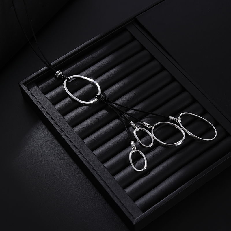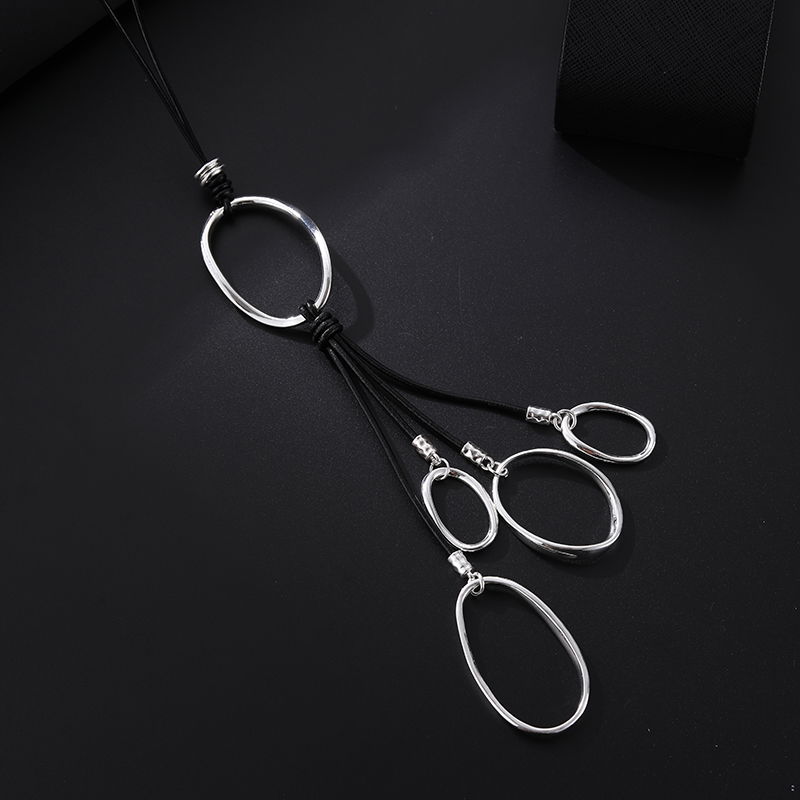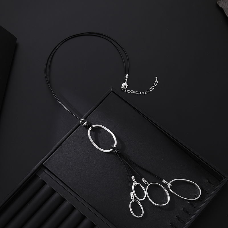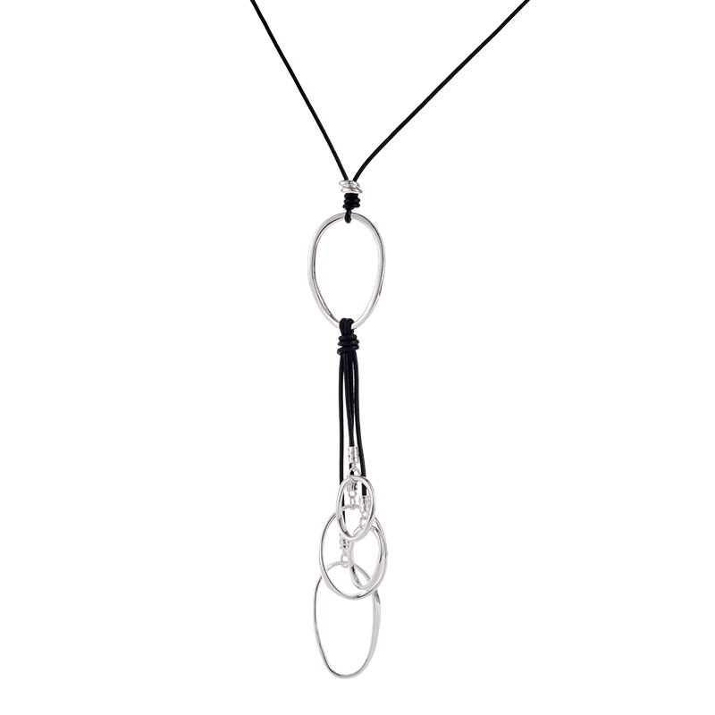 Collar de estilo moderno con cordón negro y dije protagonista de aro ovalado en tono plateado. El colgante incluye flecos finos en negro que aportan movimiento y un look contemporáneo, ideal para complementar prendas lisas y elevar outfits urbanos o de noche. En la imagen se aprecia un diseño con cierre metálico y cadena de extensión para ajuste de largo.