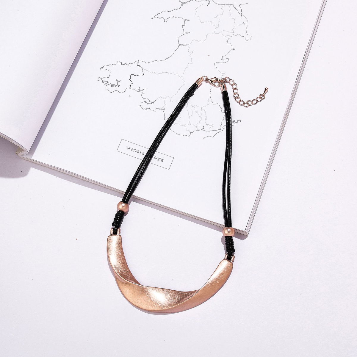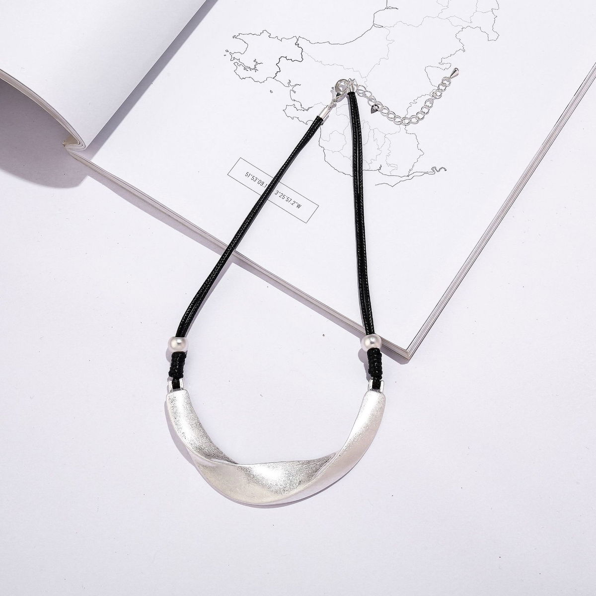 El dije curvo genera un punto focal en el centro del cuello y aporta una silueta favorecedora. La combinación de cordón negro con metalizado crea contraste y hace que el collar sea fácil de combinar con distintos accesorios y estilos.