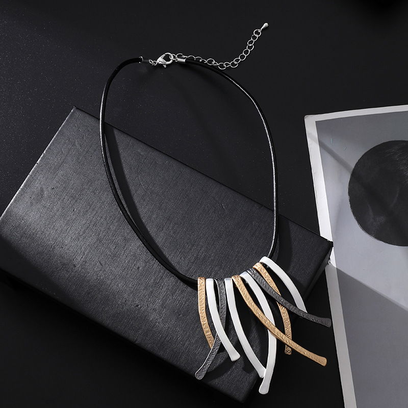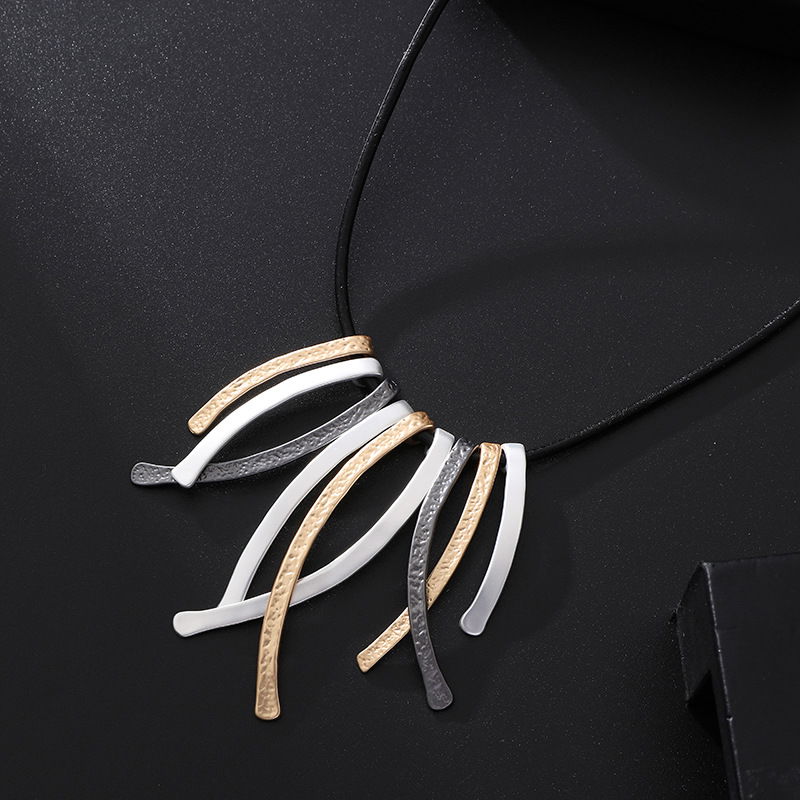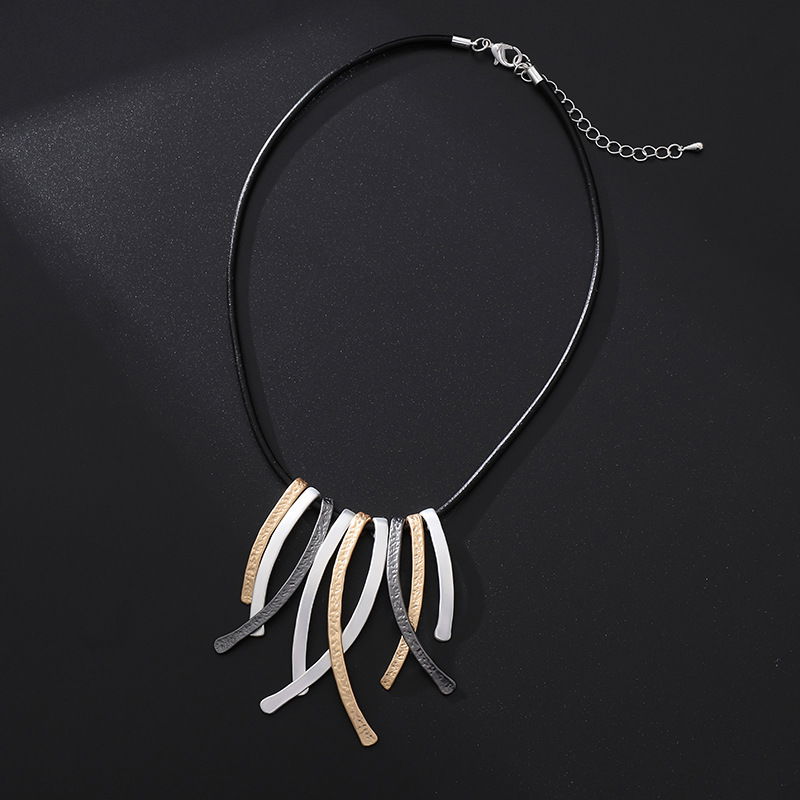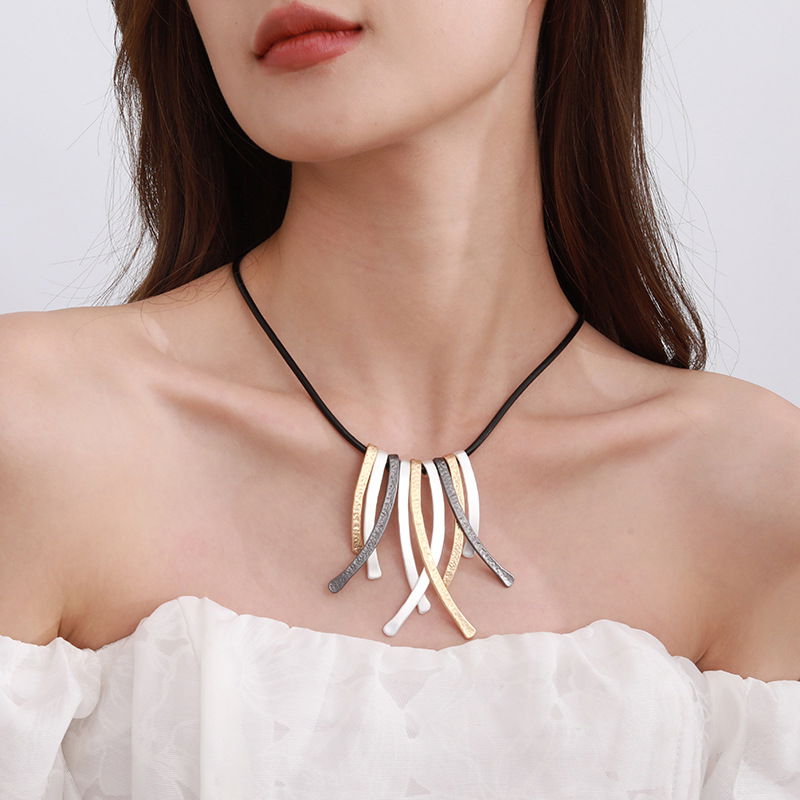 Collar de diseño moderno con cordón negro y dije protagonista compuesto por tiras colgantes alargadas de acabado texturado. El colgante reúne varias piezas delgadas en tonos metalizados tricolor (plateado, dorado y negro grafito, según se aprecia en la imagen), logrando un efecto de movimiento y un look contemporáneo con mucha presencia.