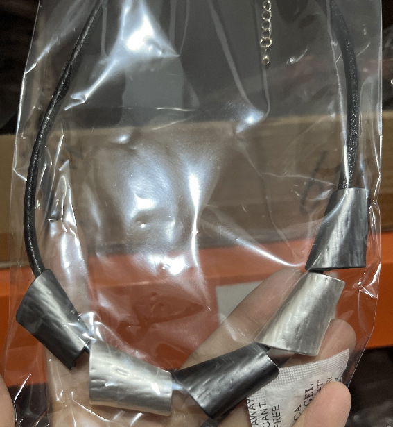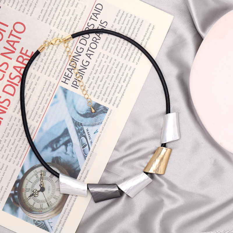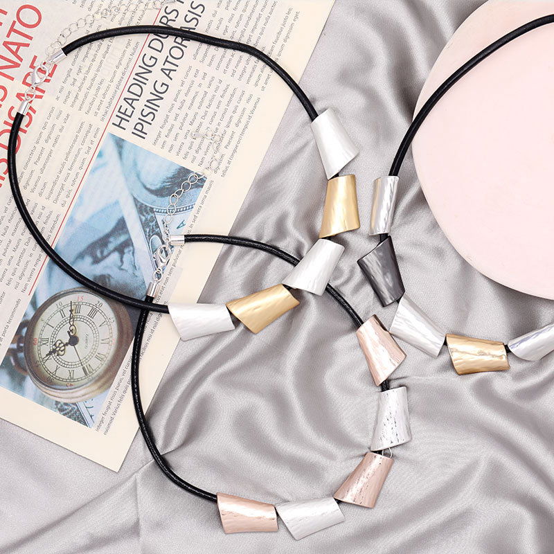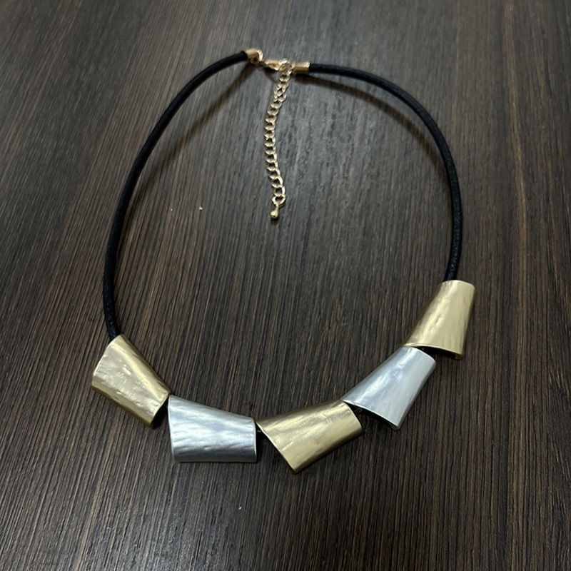 Collar de estilo moderno con cordón negro y piezas geométricas metalizadas como detalle protagonista. El diseño combina múltiples módulos de forma trapezoidal con acabado metalizado en tonos tricolor (plateado, dorado, negro grafito y oro rosado, según se observa en la imagen), logrando un look contemporáneo, elegante y fácil de combinar.