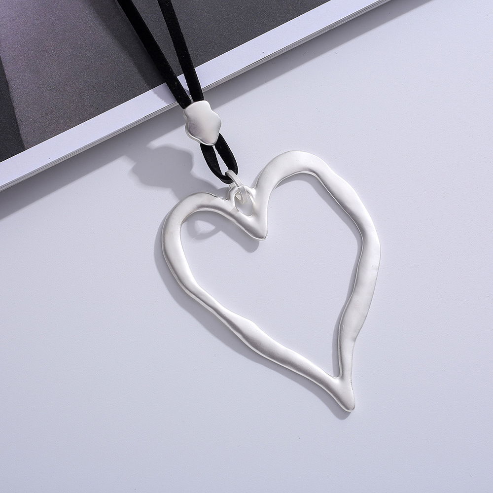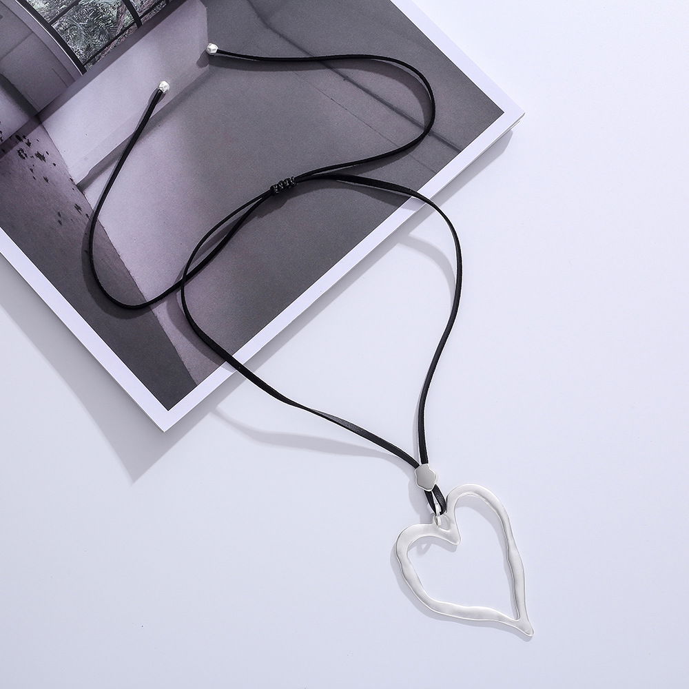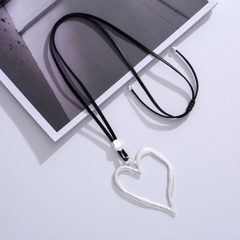 Collar de diseño minimalista con cordón negro y dije en forma de corazón con acabado plateado. El colgante presenta un corazón de contorno irregular, de estilo orgánico y moderno, ideal para sumar un detalle delicado y combinable a distintos looks. En la imagen se aprecia un sistema regulable tipo corredizo, que permite ajustar la altura del dije según el estilo deseado.
