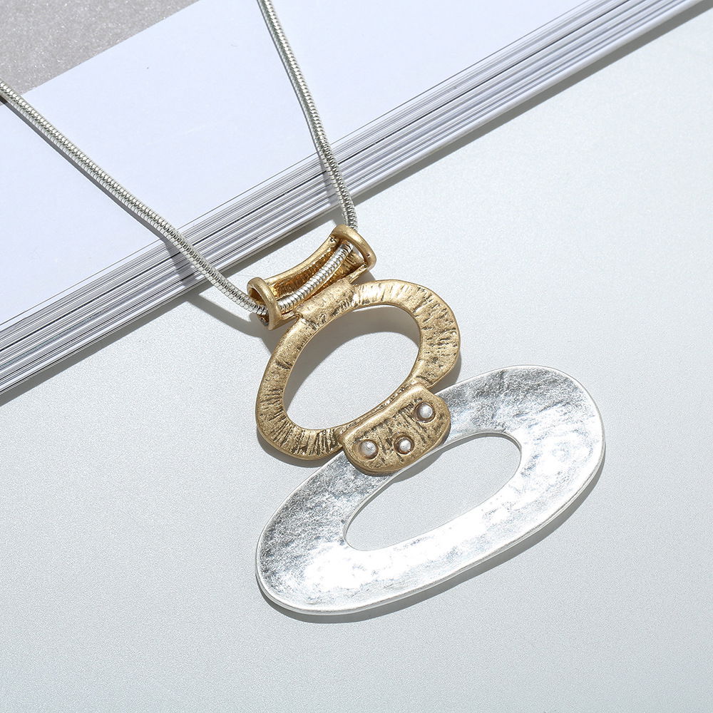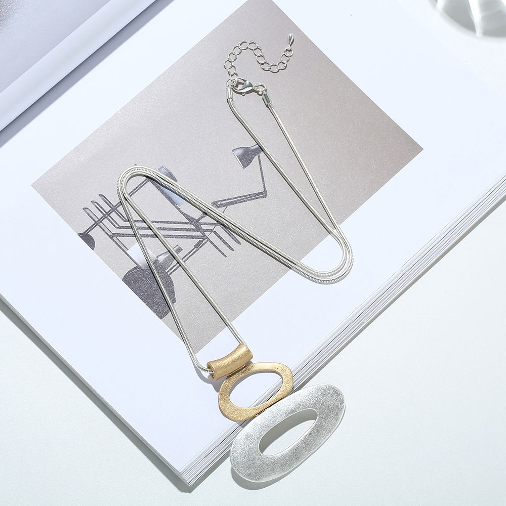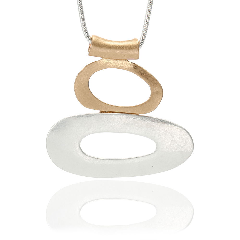 Collar de estilo moderno con cadena larga en tono plateado y colgante protagonista de diseño geométrico. El dije combina dos óvalos calados superpuestos con acabado texturado, en tonos metalizados bicolor (plateado y dorado, según se aprecia en la imagen), logrando un look contemporáneo y elegante con contraste sutil.