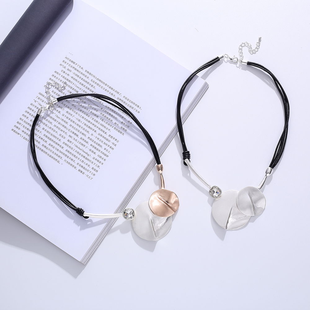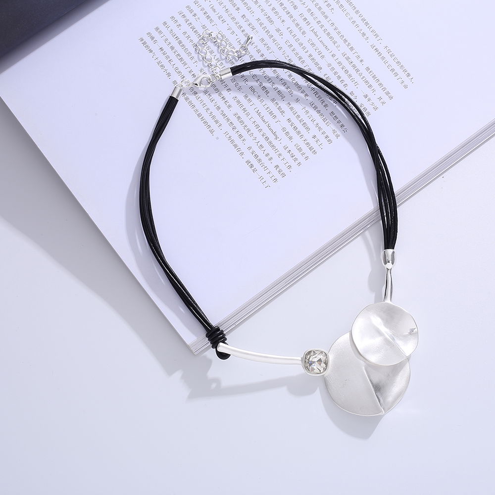 El diseño combina un cordón oscuro con un colgante de formas orgánicas en acabado plateado, acompañado por un detalle central que aporta brillo y equilibrio visual. La composición logra una estética refinada y versátil, perfecta para looks urbanos, casuales o más elegantes.