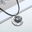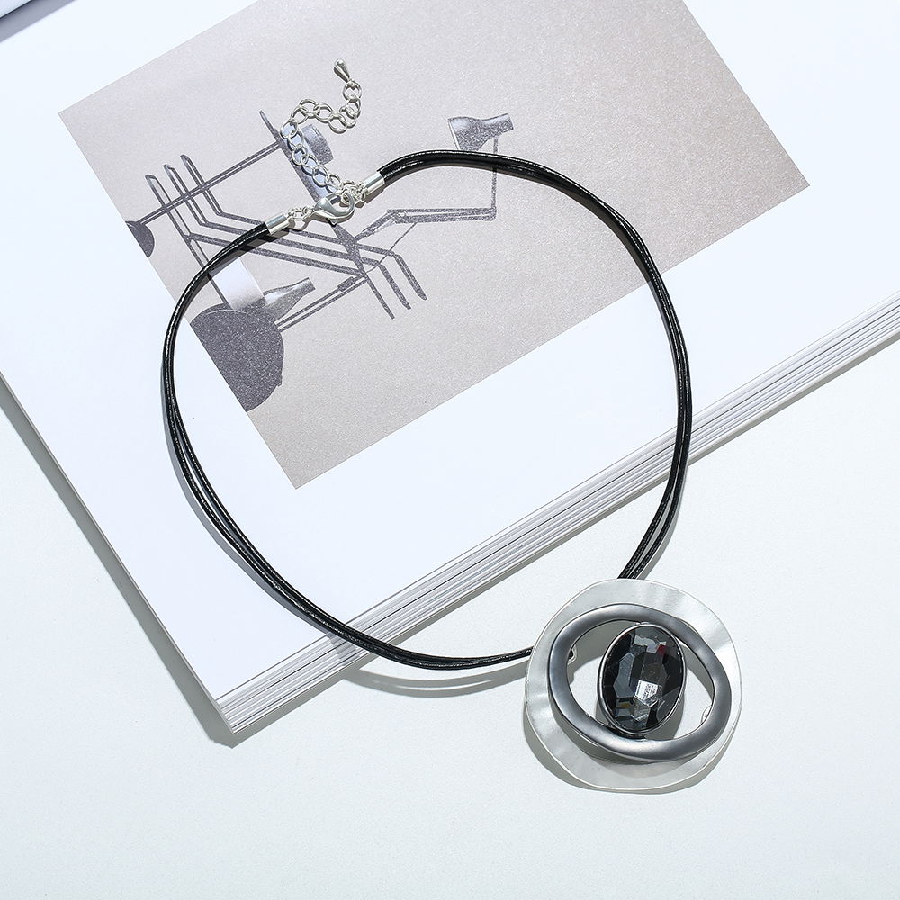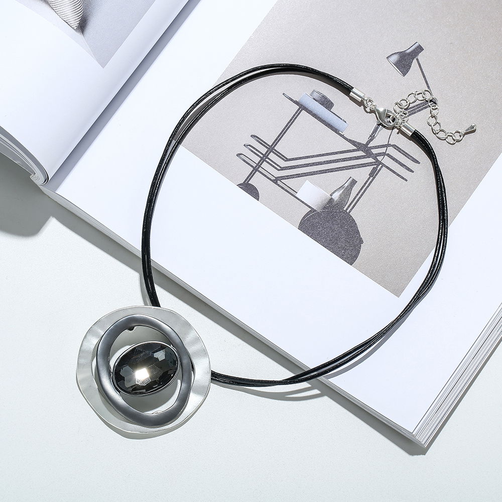 El diseño combina un cordón oscuro con un colgante circular de acabado plateado, compuesto por formas concéntricas que generan profundidad y brillo. La esfera central aporta volumen y equilibrio visual, logrando una estética contemporánea y versátil.