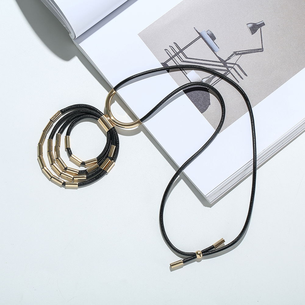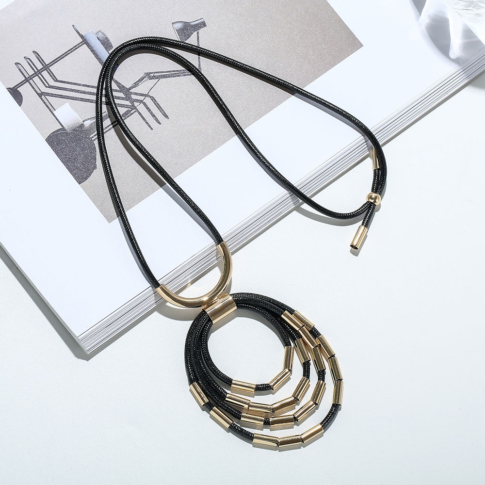 El diseño combina un cordón oscuro con un colgante circular central y aros concéntricos decorados con piezas tubulares en tono dorado. Esta composición crea volumen, textura y movimiento, logrando una estética equilibrada y actual, perfecta para looks urbanos, casuales o más elegantes.