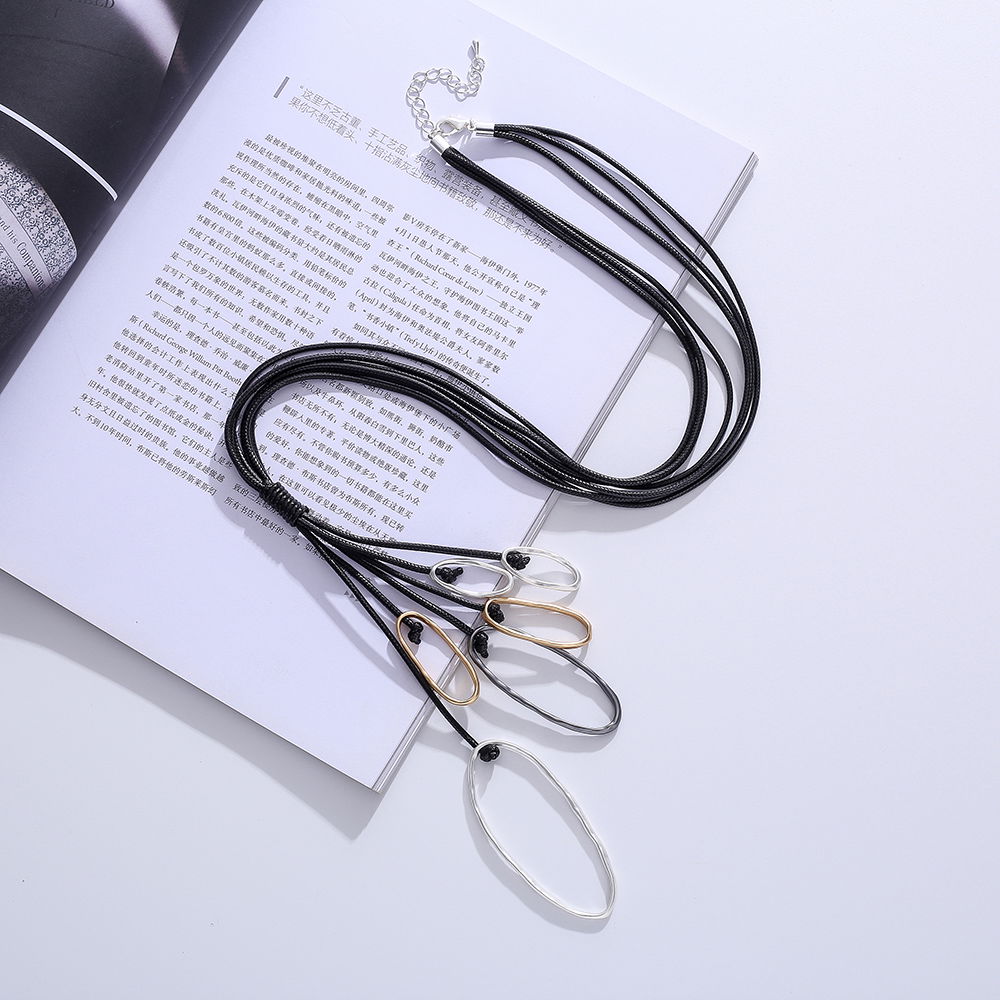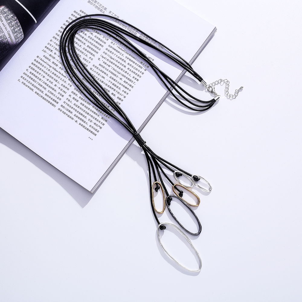El diseño combina un cordón oscuro con colgantes ovalados de distintos tamaños y tonos, integrando acabados claros, plateados y dorados de manera equilibrada. La composición genera dinamismo y convierte al collar en una opción versátil, perfecta para looks urbanos, casuales o más elegantes.