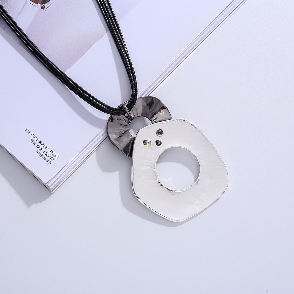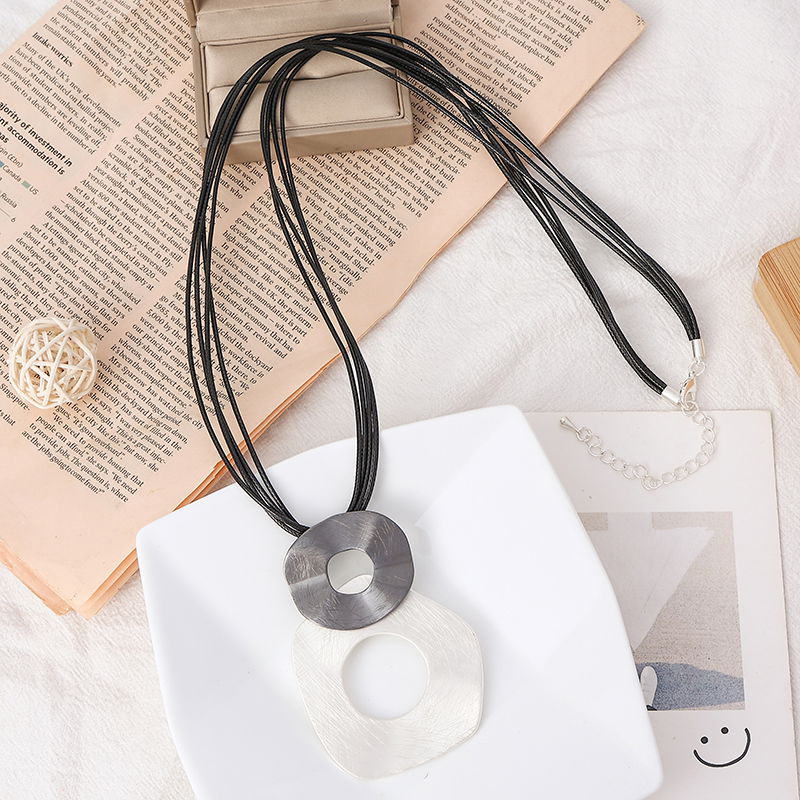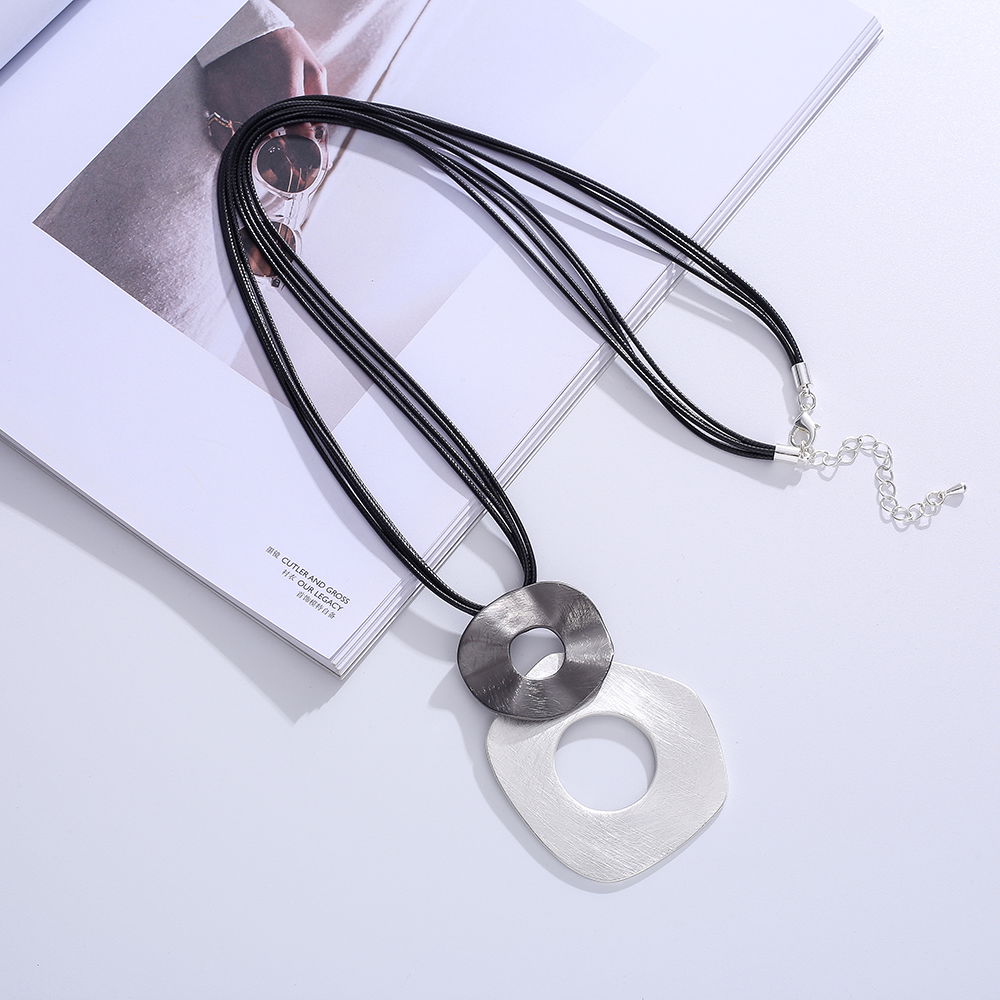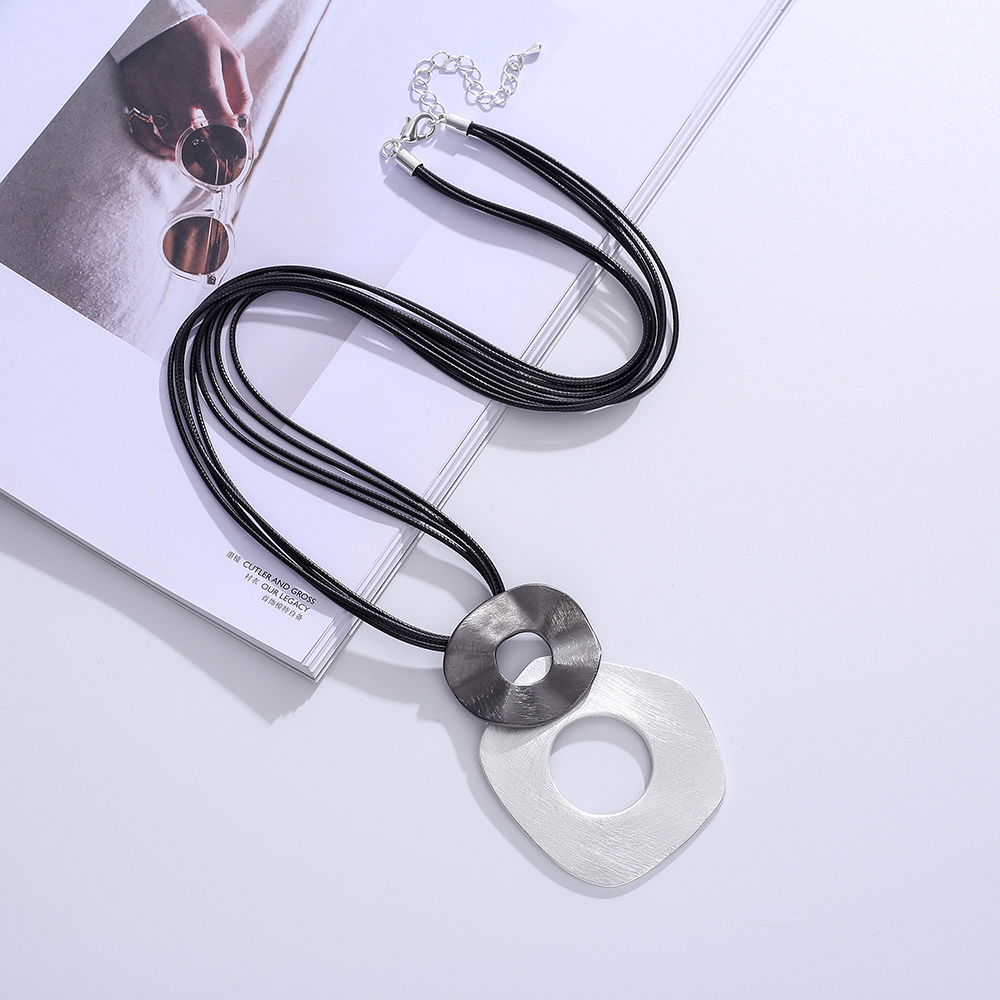 El diseño combina un cordón oscuro con dos piezas circulares de acabado metálico en tonos plateados, una de ellas con centro calado, creando un contraste armónico y actual. Su estética minimalista lo convierte en un collar versátil, perfecto para complementar outfits urbanos, casuales o más elegantes.
