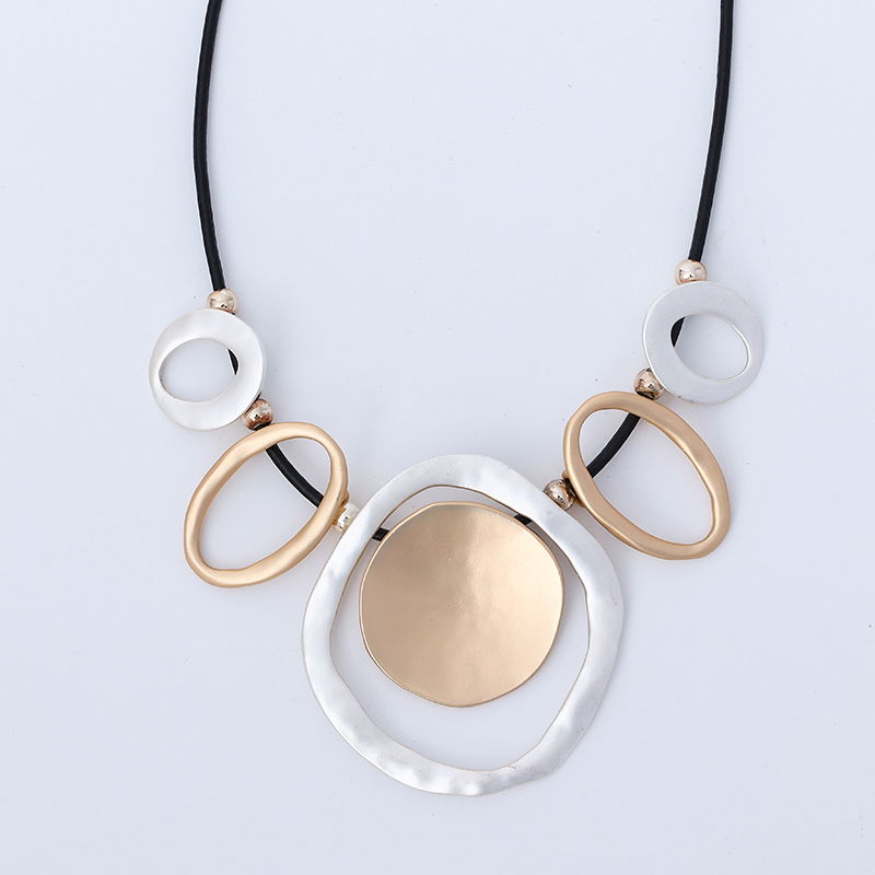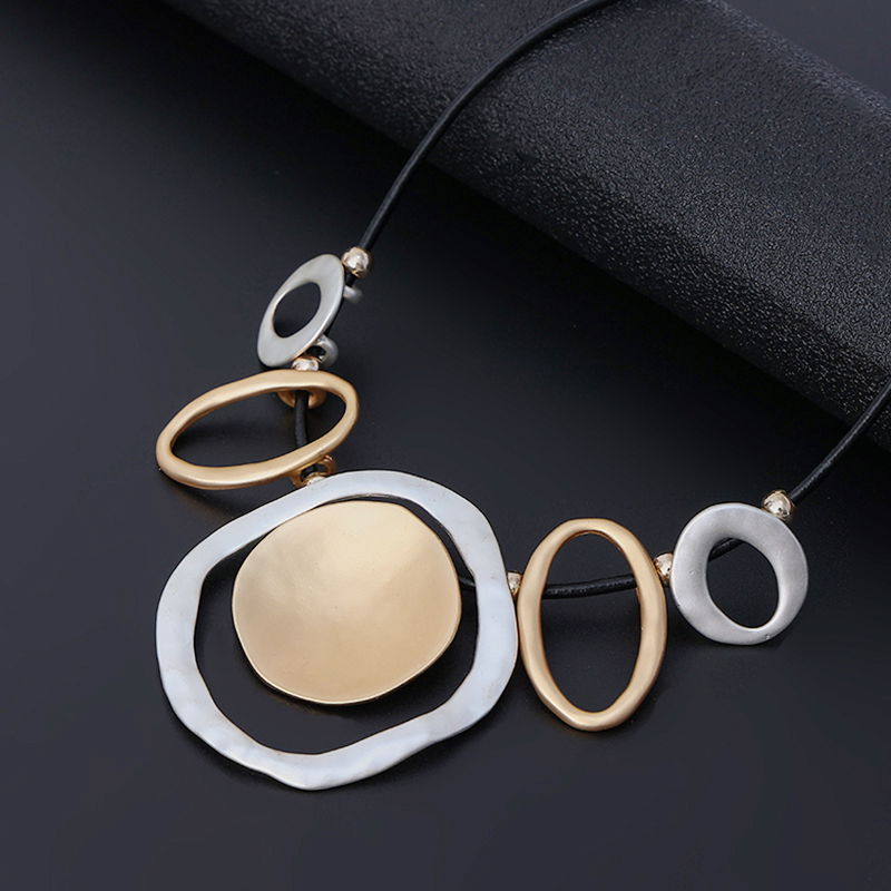El diseño combina formas geométricas orgánicas en tonos claros y dorados, dispuestas de manera armónica para lograr un equilibrio visual sofisticado. El cordón oscuro genera contraste y resalta el colgante central, convirtiéndolo en un complemento versátil para looks urbanos, casuales o más elegantes.