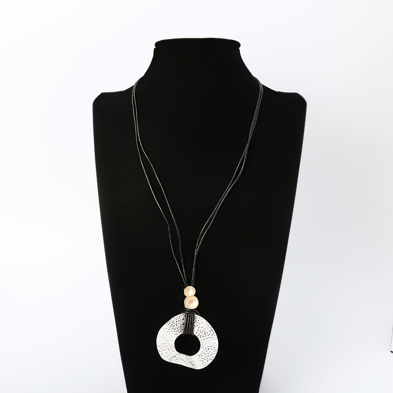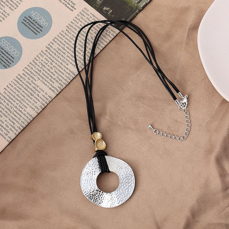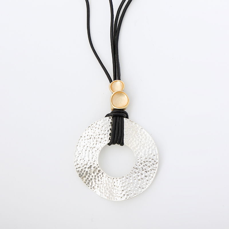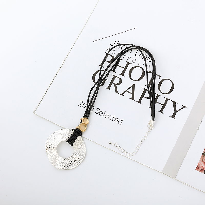 El diseño presenta un colgante circular de acabado texturado con centro calado, acompañado por un cordón oscuro que genera contraste y equilibrio visual. Su estética minimalista lo convierte en un collar versátil, perfecto para elevar outfits cotidianos o complementar estilos más elegantes.