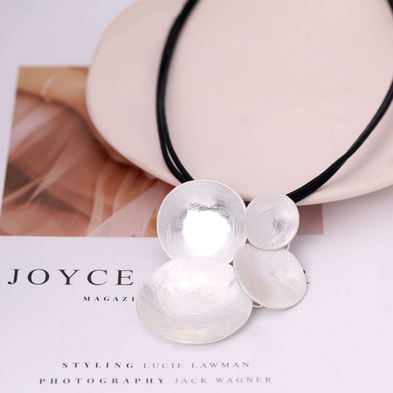 El diseño presenta un colgante compuesto por discos metálicos de acabado dorado con textura, dispuestos de forma armónica para crear volumen y brillo. El contraste con el cordón oscuro resalta el colgante y aporta un efecto visual refinado, perfecto para elevar outfits simples o acompañar looks más elegantes.