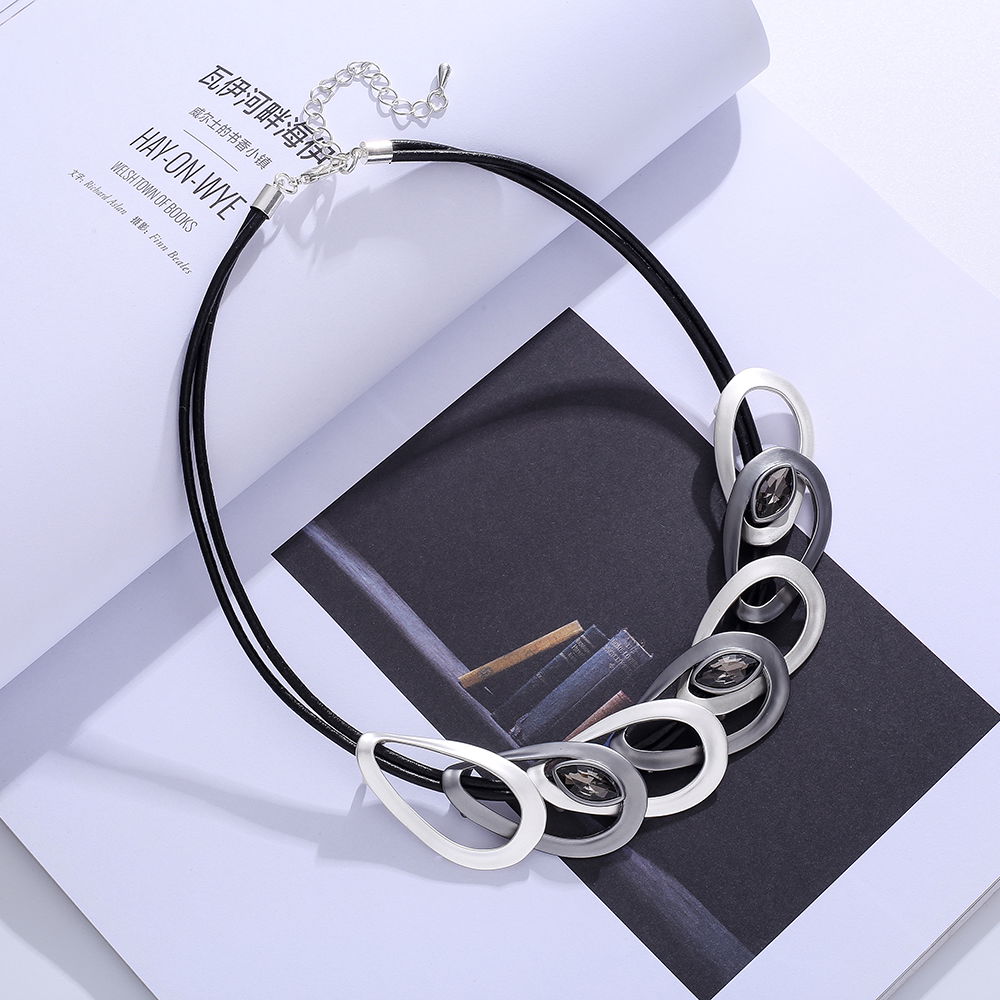 El diseño combina piezas circulares en tonos gris, blanco y negro, dispuestas de forma armónica para generar contraste y dinamismo. La base oscura realza las formas y convierte a este collar en un complemento fácil de combinar con distintos estilos.