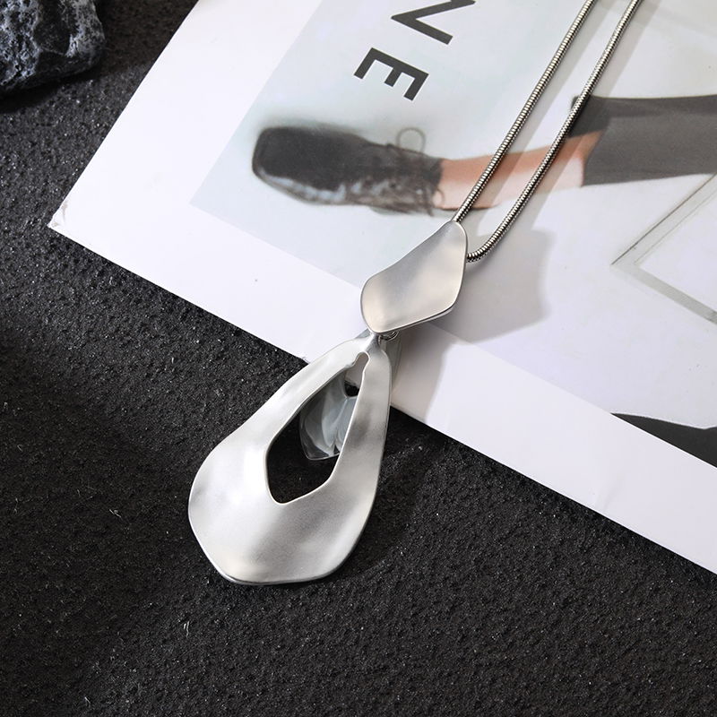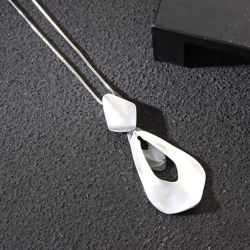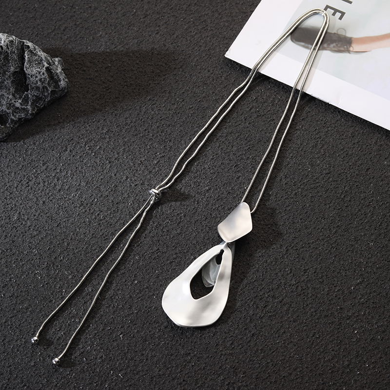 El diseño presenta un colgante de formas orgánicas y curvas suaves en acabado plateado, que aporta movimiento y ligereza visual. La cadena fina regulable completa una estética minimalista y sofisticada, perfecta para elevar looks simples o acompañar estilos más elegantes.