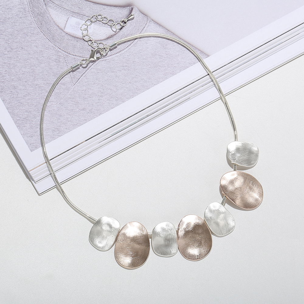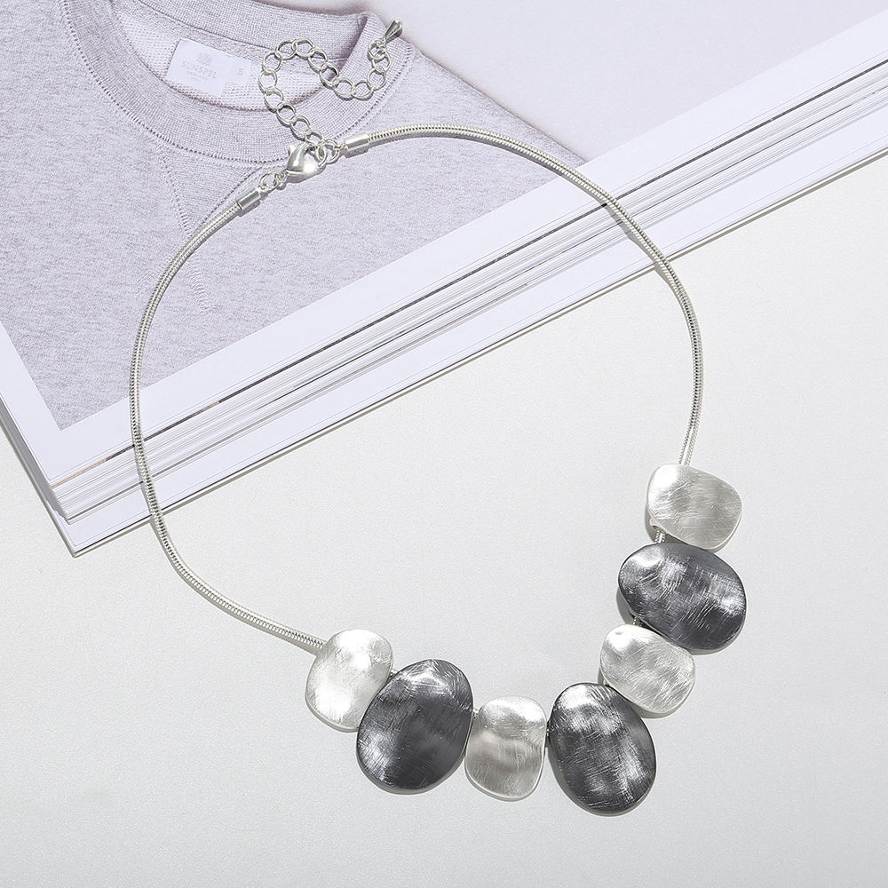 El collar presenta una composición de piezas metálicas en tonos grises y plateados con acabado texturado, dispuestas de forma armoniosa para crear volumen y movimiento. La combinación de tonalidades aporta profundidad visual y un estilo moderno, perfecto para elevar cualquier look.