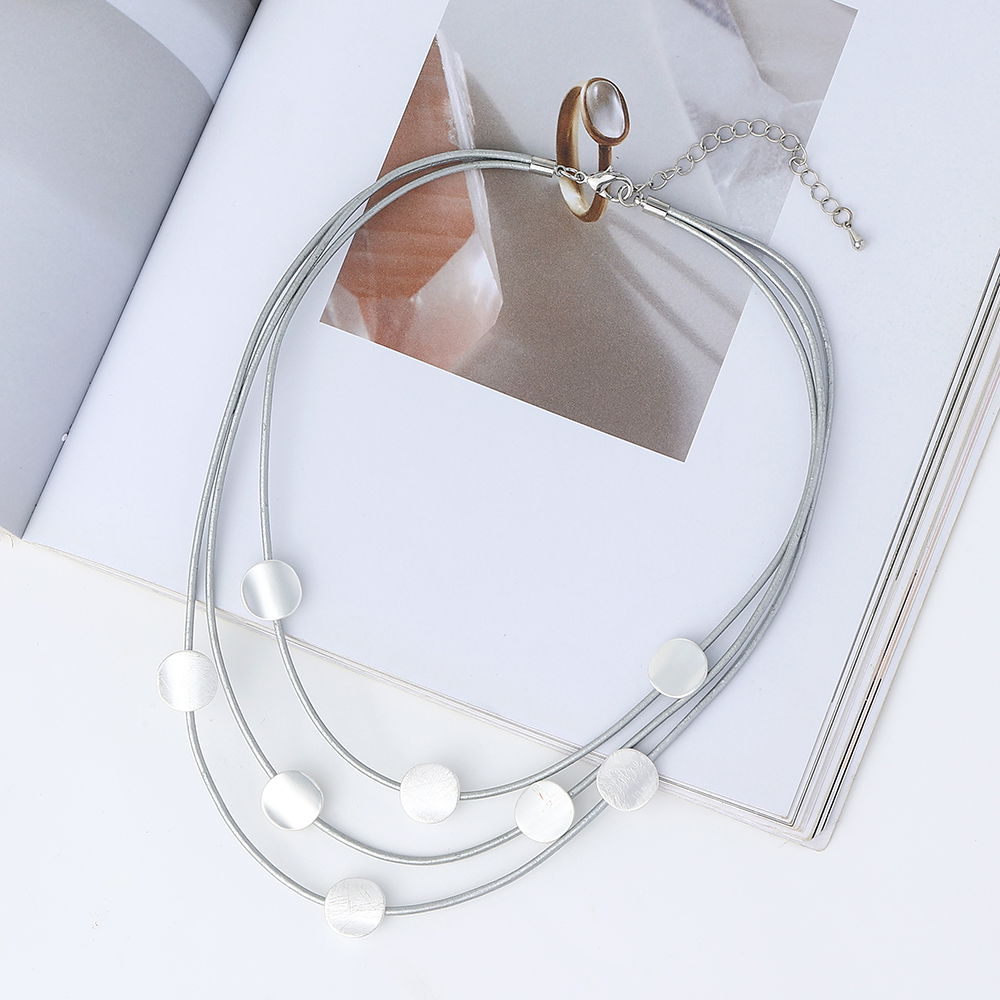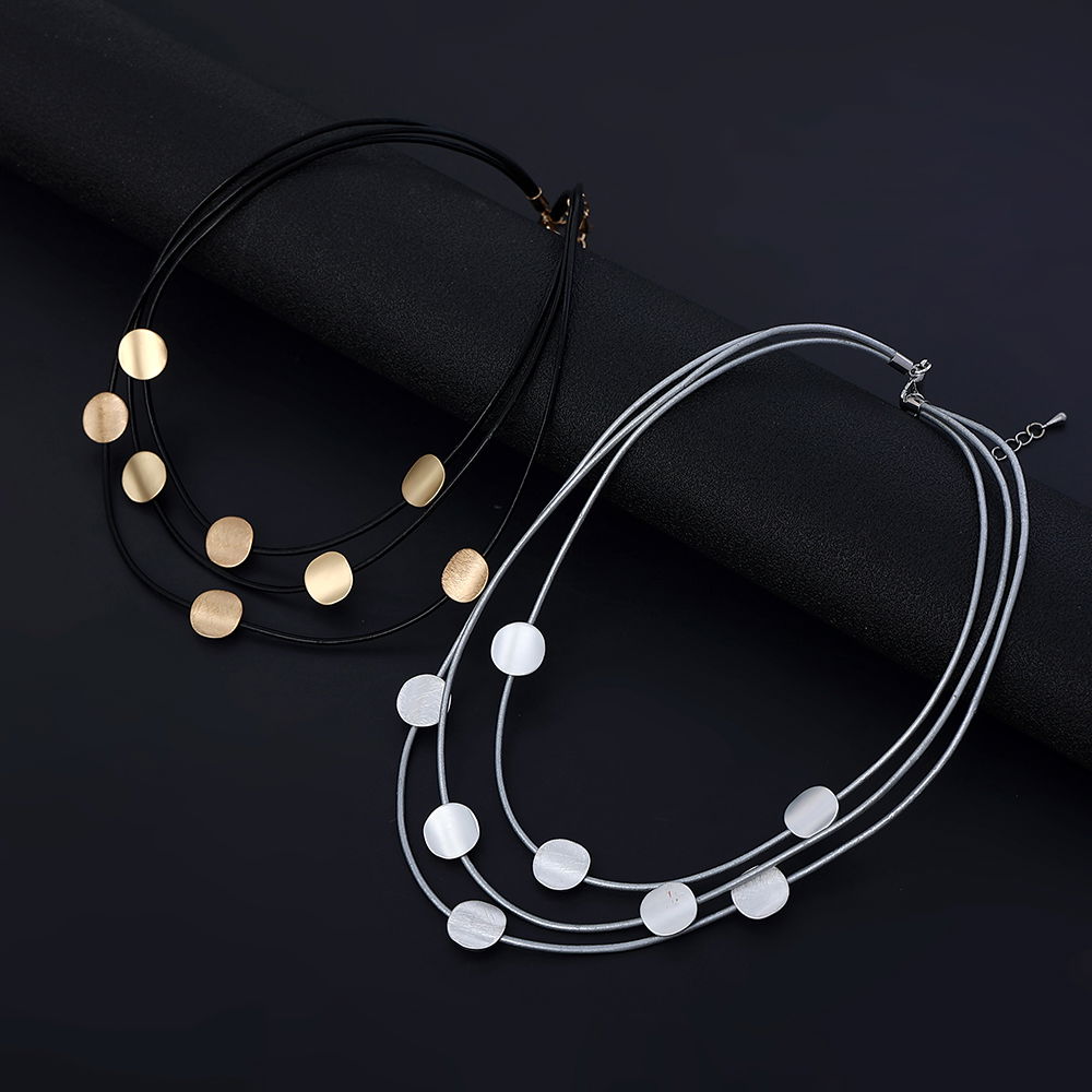 El diseño combina tres cordones negros superpuestos con pequeñas piezas circulares de acabado rose, distribuidas de forma equilibrada para crear movimiento y brillo sutil. La composición aporta profundidad y sofisticación, logrando un collar versátil que se adapta tanto a outfits casuales como a propuestas más elegantes.