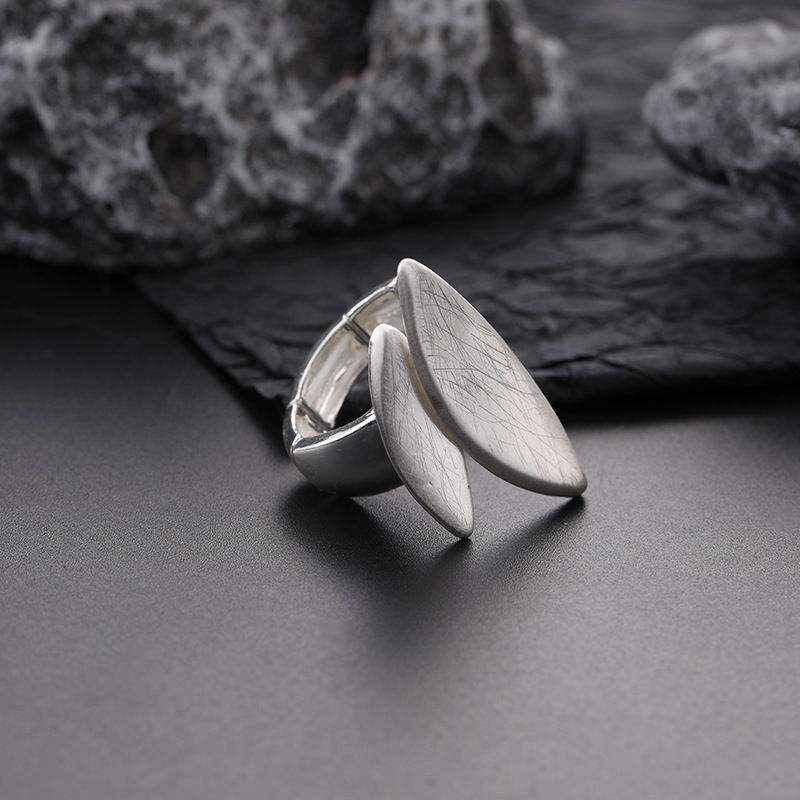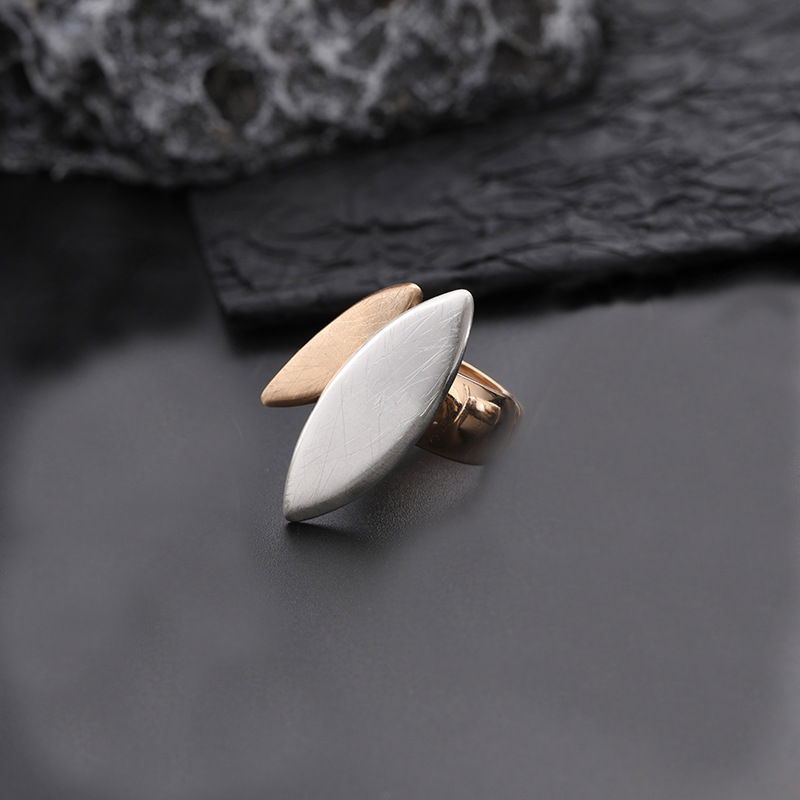 Anillo de diseño moderno con forma de hoja y terminación combinada, ideal para sumar un toque distintivo y elegante a cualquier look. Su estética orgánica y minimalista lo convierte en un accesorio versátil, perfecto tanto para uso diario como para ocasiones especiales.