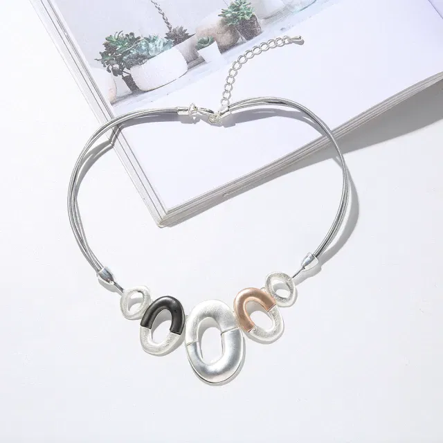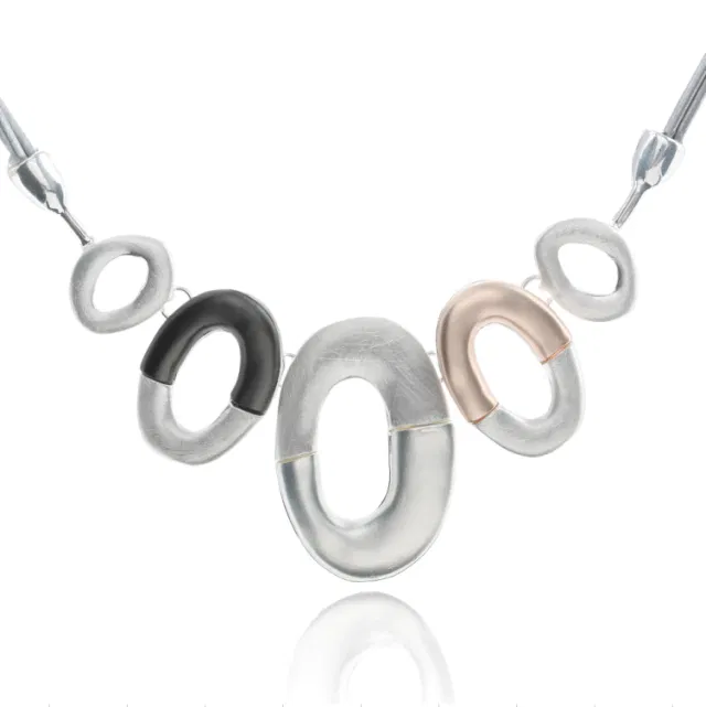 Collar corto de diseño contemporáneo con piezas circulares combinadas en tonos gris, plateado y dorado rose. Su composición geométrica aporta un estilo moderno y sofisticado, ideal para elevar looks urbanos o elegantes.