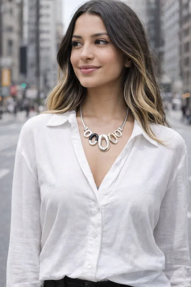 Realizado en aleación de zinc libre de níquel, ofrece una estructura liviana y cómoda para el uso diario. El diseño equilibrado de los círculos crea un punto focal atractivo y versátil para distintas ocasiones.