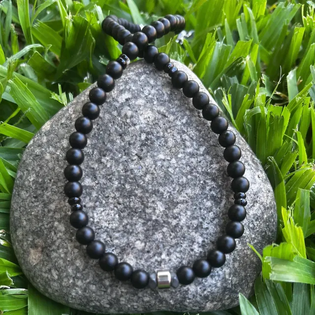 El ónix mate es una piedra asociada a la protección energética y la fortaleza interior, ayudando a absorber energías negativas y a mantener la estabilidad emocional. El hematite es reconocido por su capacidad de enraizamiento, aportando equilibrio, concentración y seguridad personal.