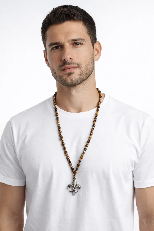 Collar largo tipo rosario realizado con piedras naturales de ojo de tigre en medidas de 8 mm y 4 mm, cuidadosamente combinadas para lograr un diseño elegante y con fuerte presencia. Incluye un dije central de flor de lis en acero macizo que aporta carácter y estilo atemporal.