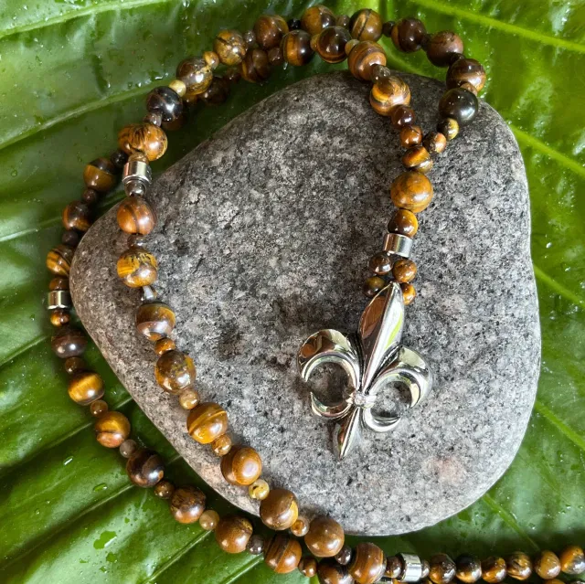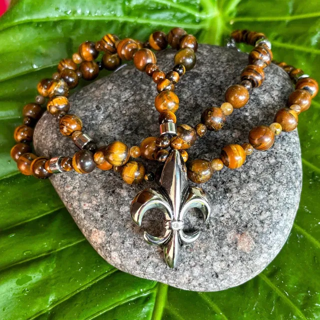 El ojo de tigre es una piedra vinculada a la protección, la fuerza interior y la confianza personal, ayudando a potenciar la seguridad y la toma de decisiones. Su energía equilibrante lo convierte en un accesorio ideal para quienes buscan firmeza, enfoque y determinación en su día a día. La Flor de Lis representa poder, soberanía, honor y pureza.