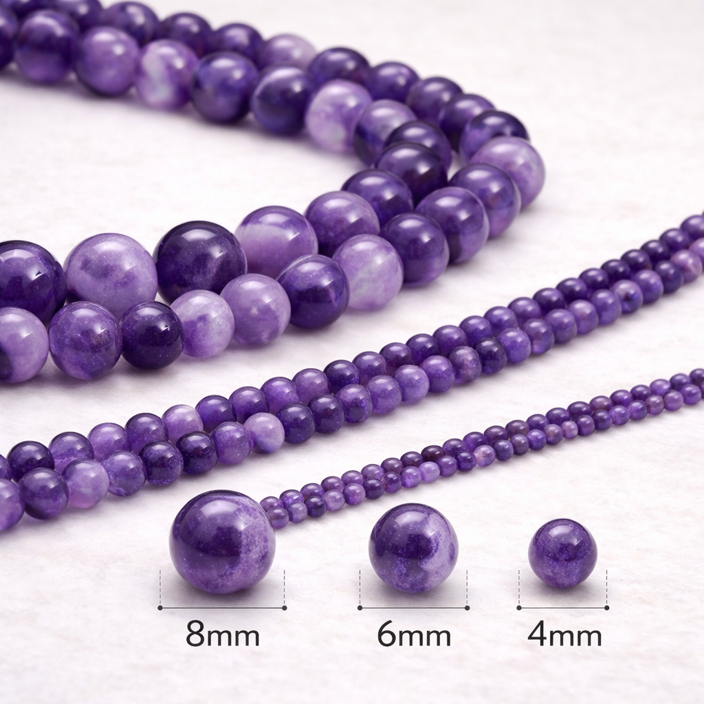 Las cuentas suelen presentar violeta, lila o púrpura con variaciones naturales en tono y transparencia. Cada cuenta puede variar levemente en dibujo y tonalidad, manteniendo el carácter natural del material.