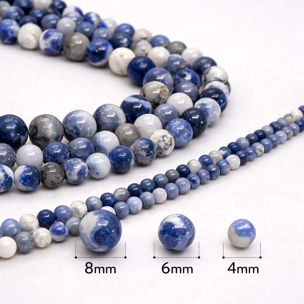 Cuentas de piedra natural Sodalita, ideales para armado de bijouterie y accesorios con estética intensa y elegante. Se caracterizan por sus tonos azules profundos, con vetas y zonas más claras que pueden incluir detalles blanquecinos, lo que aporta un efecto visual único en cada cuenta. Son una opción muy elegida para pulseras, collares y diseños con inspiración boho, urbana o minimalista.